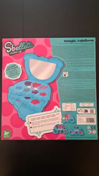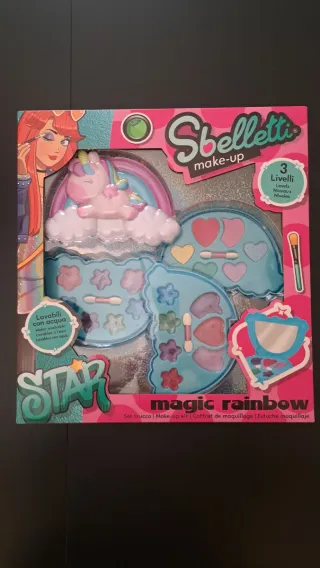 Set di trucchi per bambine Sbelletti Magic Rainbow. - Include 3 livelli di trucchi. - Prodotti lavabili con acqua. - Design a tema unicorno e arcobaleno.