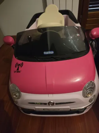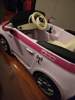Auto elettrica per bambini, modello Fiat 500. - Colore rosa e bianco. - Sedile beige. - Volante nero. - Parabrezza trasparente. - Logo Fiat sul frontale.