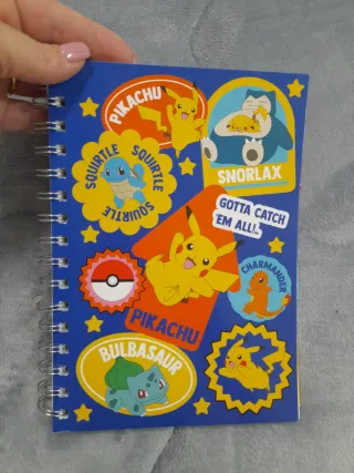 Quaderno con copertina blu a tema Pokemon, raffigurante Pikachu, Squirtle, Snorlax, Charmander e Bulbasaur. - Design colorato con personaggi iconici. - Pastelli a cera impilabili inclusi.