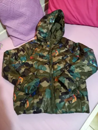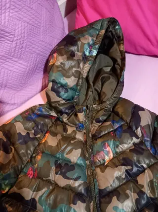 Caldo piumino per bambina con una divertente stampa camouflage arricchita da dettagli di uccelli colorati. - Stampa camouflage con uccelli. - Cappuccio integrato. - Chiusura con zip frontale.