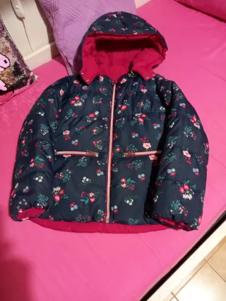 Bellissimo piumino per bambina, perfetto per le giornate più fredde. È reversibile, offrendo due look in uno. - Fantasia floreale su fondo blu scuro. - Interno fucsia vivace. - Cappuccio integrato. - Chiusura con zip.