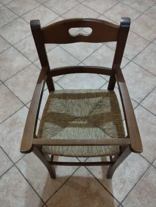 Seggiolone in legno con seduta in paglia. - Struttura in legno. - Seduta intrecciata in paglia.
