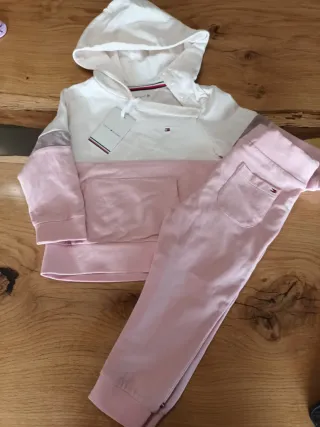 Tuta Tommy Hilfiger per bambina, composta da felpa con cappuccio e pantaloni. - Felpa bianca e rosa con tasca frontale. - Pantaloni rosa. - Logo Tommy Hilfiger.
