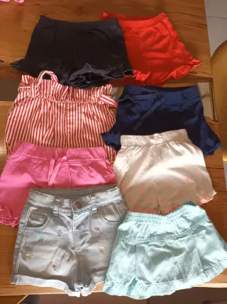 Set di pantaloncini per bambina. - Pantaloncini a righe rosse e bianche. - Pantaloncini bianchi con dettagli rosa. - Pantaloncini blu. - Pantaloncini in denim azzurro con ricamo. - Pantaloncini azzurri.