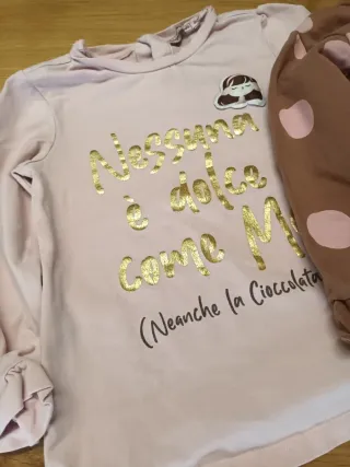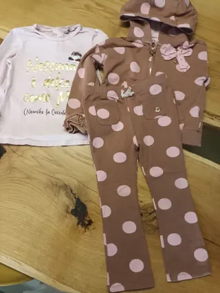 Bellissimo set da bambina Marines composto da 3 pezzi. - T-shirt a maniche lunghe rosa con stampa. - Felpa con cappuccio marrone a pois rosa. - Pantaloni marrone a pois rosa.