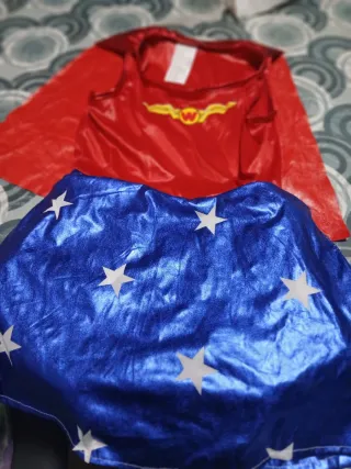 Costume da supereroina per bambina, taglia 10/11 anni. - Corpetto rosso con dettagli bianchi. - Gonna blu brillante con stelle bianche. - Mantello rosso. - Maniche lunghe bianche.completo e solo un po macchiato davanti e giù ai piedi perché tocca a terra per il resto è buono ha solo un piccolo difetto sulla gonna guarda foto