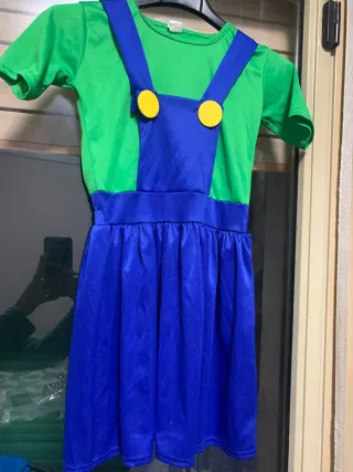 Vestito da bambina a tema personaggio dei videogiochi, ispirato a Luigi. - Maglia verde a maniche corte. - Salopette blu attaccata con bottoni gialli. - Gonna a balze blu. - Tessuto leggero e confortevole.