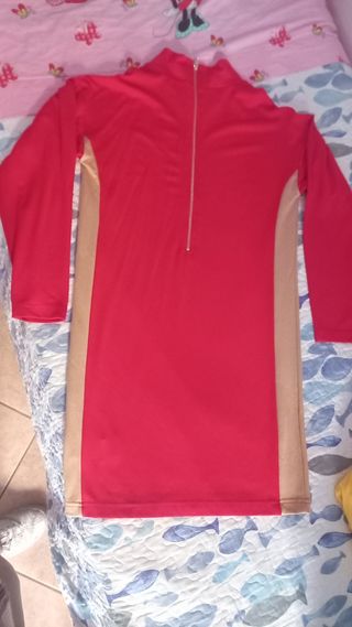 Vestito smanicato, rosso con paillets sul davanti sulla parte del seno e dietro sullamparte alta della schiena. Sotto gonna in tulle rosso con elastico nel bordo ( come da ultima foto) così da rendere la gonna a palloncino, cerniera sulla sinistra, sul fianco. All'interno felpatino. Usato ma ben conservato