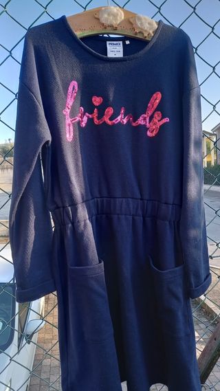 Vestitino blu felpato con scritta con pailletts fucsia davanti, 2 tasche avanti ed elastico in vita, indossato pochissime volte taglia 12 anni. 146 cm