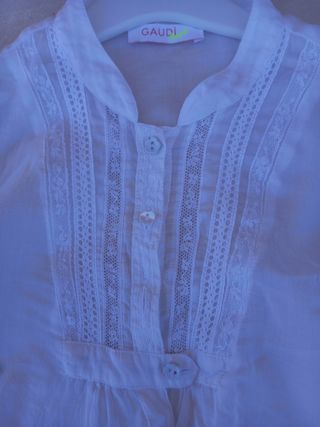 Camicia cotone bianca molto leggera con intarsi all'uncinetto sul davanti e allacciatura con bottoncini, usata ma in buono stato, solo un filo tirato in basso sul davanti come da ultima foto