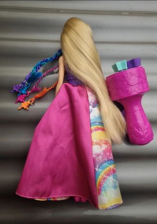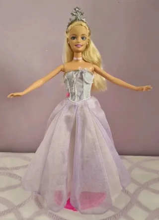 Barbie in ottime condizioni, per quanto riguarda il corpo, trucco e i capelli (sono stati riacconciati con elastico sostituito), cedo con il suo vestito double face originale in buono stato con qualche lieve difetto come il tulle un pò tirato e il filo del fiocchetto mancante/incompleto, presente la sua coroncina, collanina e orecchini, senza scarpe e altri accessori, come da foto. Piedistallo in foto non incluso.