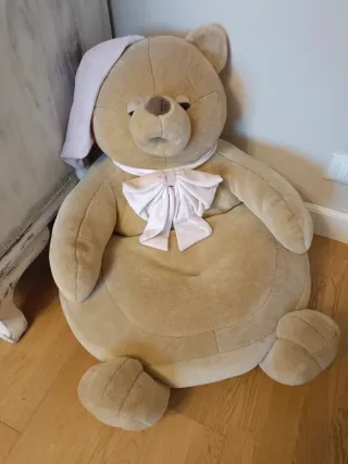 Comoda poltrona a forma di pupazzo orsacchiotto, perfetta per arredare una cameretta o un angolo relax. - Morbido tessuto color beige. - Fiocco decorativo rosa. - Cappello da notte rosa. - Seduta ampia e accogliente.