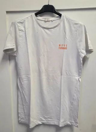 T-shirt bianca da ragazzo con stampa. - Stampa PAST FORWARD con elementi grafici viola e arancioni. - Girocollo. - Maniche corte.