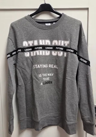 Felpa grigia da ragazzo del marchio Blukids, con stampa Stand Out sul davanti e dettagli a nastro sulle maniche. - Stampa Stand Out a contrasto. - Nastro decorativo Future Legend sulle maniche. - Girocollo. - Maniche lunghe. - Polsini e fondo a costine.