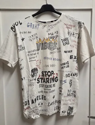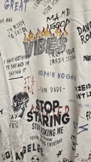 T-shirt a maniche corte per ragazzo con stampa Vibes e scritte. - Stampa Vibes con fiamme. - Grafiche Stop staring e Los Angeles. - Design con scritte Cool, Great, Make good, Dange rous, Never, Friends don't lie, Find a way, Do not disturb, Let's rock e Pink no.