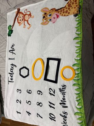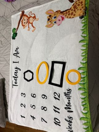 Coperta morbida per immortalare i primi mesi del tuo bambino. Perfetta per creare ricordi speciali. - Design con simpatici animali della giungla: scimmietta e giraffa. - Bordi decorati con foglie verdi. - Include numeri e scritte per segnare settimane e mesi.