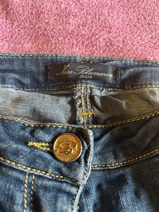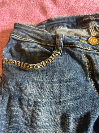 Jeans per bambina firmati Miss Blumarine, con dettagli scintillanti. - Vita media. - Tasche anteriori impreziosite da strass. - Chiusura con bottone e zip. - Tessuto denim.