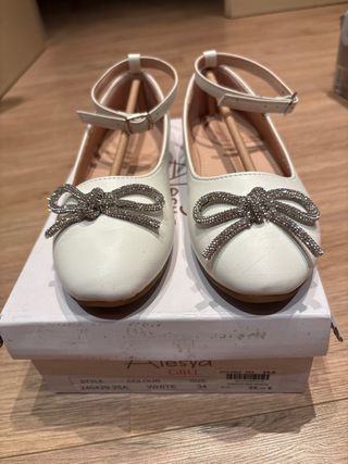 Eleganti scarpine ballerine per bambina, perfette per occasioni speciali come cerimonie. - Colore bianco. - Decorazione a fiocco con strass. - Cinturino alla caviglia con fibbia. - Suola in gomma. Usate solo 1 volta