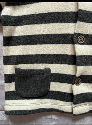 cardigan con cappuccio per bambino, taglia 4 anni, fantasia a righe bianco e grigio scuro, con bottoncini frontali e due comode taschine sul davanti. Modello pratico, caldo e super carino per l’uso quotidiano. ✨ Composizione: • 40% Cotone • 48% Acrilico • 3% Elastene Tessuto morbido, elasticizzato e caldino, ideale per l’autunno/inverno, perfetto sopra una t-shirt o una camicia.