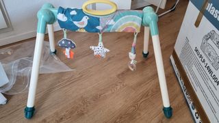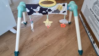 Palestrina per neonati, con simpatici giochini pendenti. - Struttura in plastica color menta e bianca. - Tessuto con disegni di uccelli, sole e nuvole. - Giochi pendenti a forma di stella, nuvola e pesce. - Maniglia gialla per il trasporto.