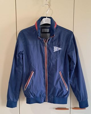 Giubbino OVS per bambino, taglia 12-13 anni (158cm), di colore blu. Chiusura con zip frontale. Collo alto con dettagli rossi. Tasche laterali con zip. Stampa WESTERN 333 sul petto.