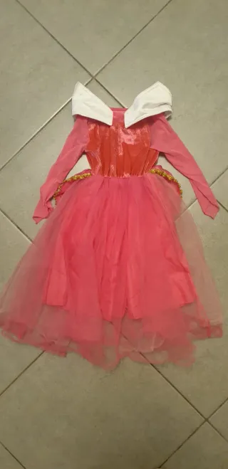 Bellissimo costume da principessa Aurora in tonalità di rosa, adatto per un'altezza di 110 cm, Ai Meng Baby. Perfetto per carnevale o feste in maschera! Con maniche lunghe rosa, gonna multistrato in tulle fucsia e rosa, dettagli dorati sul corpetto e sulla cintura e colletto bianco con pendente. Ne ho un altro identico blu, eventualmente insieme sono perfetti per due gemelle! Se comprati entrambi insieme li vendo a 20€ totali!