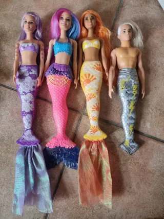 Lotto composto da Barbie sirena e Ken sirena. - Barbie con coda viola e top a stella. - Barbie con coda rosa e top blu. - Barbie con coda gialla e top giallo. - Ken con coda argentata