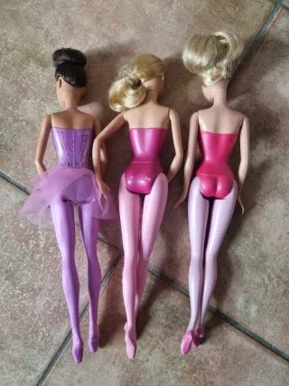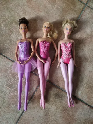 Lotto composto da tre bambole Barbie in versione ballerina. Le bambole indossano abiti eleganti e colorati. - Tre bambole Barbie incluse. - Abiti da ballerina. - Colori vivaci.