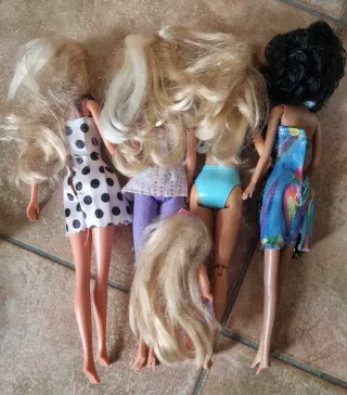 Lotto composto da 5 bambole di diverse dimensioni e stili. - 4 bambole grandi con capelli biondi e una con capelli ricci neri. - 1 bambola piccola con capelli biondi. - Vestiti colorati e dettagliati.