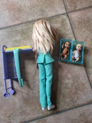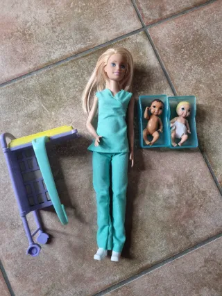Set Barbie con bambola infermiera, due gemelli e un carrello. - Bambola Barbie con camice e pantaloni da infermiera. - Due culle con gemelli. - Carrello portaoggetti viola e azzurro. (mancano pezzi)
