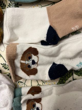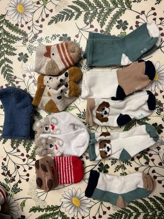 Lotto misto di calzini per neonato, con fantasie e colori assortiti. - Calzini con fantasie di orsetti. - Calzini a righe rosse e bianche. - Calzini a tinta unita blu. - Calzini con fantasia a pois. - Calzini con fantasia a strisce marroni e bianche. - Calzini verdi con punta e tallone bianchi. - Calzini bianchi con fantasia di orsetti. - Calzini bianchi con punta e tallone marroni e neri. - Calzini bianchi con fantasia di orsetti e dettagli verdi. - Calzini bianchi con punta e tallone verdi e marroni. Taglie varie ultima fila di 5 paia fi calzini taglia 13-14