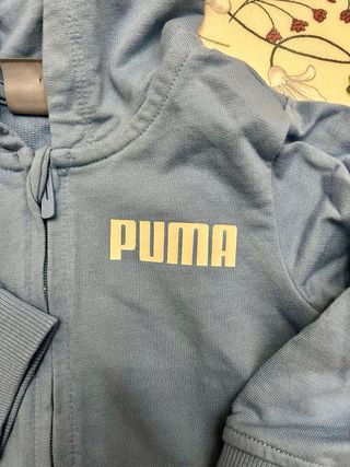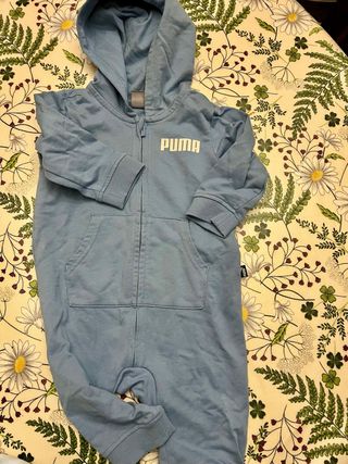 Comoda tutina intera per neonato firmata Puma, perfetta per i più piccoli. Realizzata in morbido tessuto, presenta un design pratico e alla moda. - Colore azzurro. - Cappuccio integrato. - Chiusura con zip frontale. - Tasche applicate sul davanti. Indossata una volta praticamente nuova