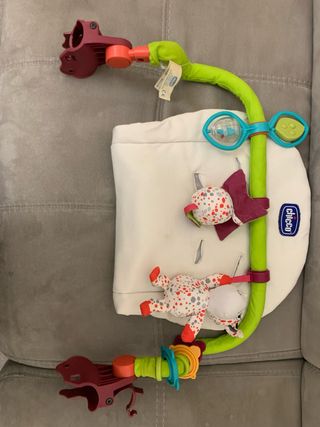 Barra gioco e riduttore Chicco Polly Progress, ideale per intrattenere i più piccoli. - Colore verde brillante con dettagli in fucsia e turchese. - Due simpatici pupazzi pendenti. - Clip di aggancio regolabile per diverse superfici.