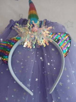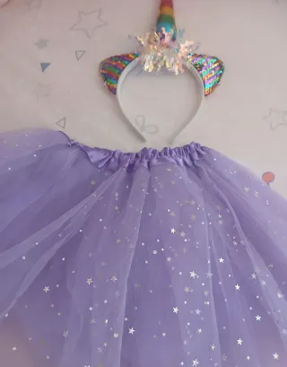 Set di tutu viola con dettagli di stelle d'argento e una diadema da unicorno. - Tutu in tulle con stampa di stelle. - Diadema con corno da unicorno e orecchie. - Abbellimenti di paillettes e frange sulla diadema.