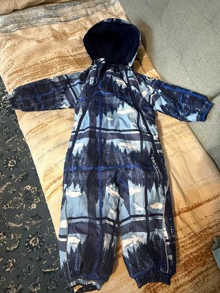 Tuta da neve per neonati con stampa bosco e a quadri. Design bosco e quadri in tonalità blu. Cappuccio integrato. Chiusura con cerniera frontale.