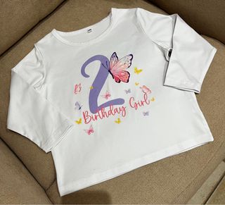 Adorabile t-shirt bianca a maniche lunghe da bambina perfetta per festeggiare il 2º compleanno. In tessuto morbido e leggero, la maglietta presenta una graziosa stampa centrale con un grande numero 2 color lilla, decorato da una farfalla dai toni rosa e lilla e circondato da tante piccole farfalle colorate (rosa, gialle e lilla). Sotto il numero è presente la scritta “Birthday Girl” in un elegante font rosa. Ideale come outfit per la festa, shooting fotografico o come ricordo speciale del secondo compleanno! Indossata neanche mezz’oretta per scattare due foto, pari al nuovo. Taglia 1-2 anni #maglia #maglietta #tshirt #bianca #2anni