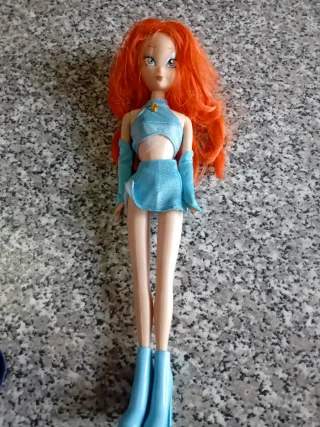 Bambola di Bloom delle Winx, con capelli rossi e abito azzurro. - Abito scintillante azzurro. - Maniche lunghe azzurre. - Stivali azzurri.