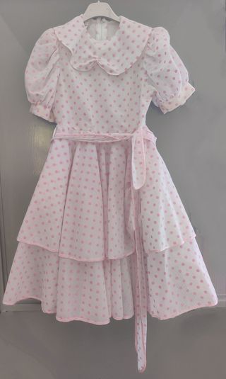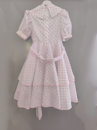 Vestitino bimba con fantasia a pois. Taglia 8-9 anni. Chiusura con cerniera posteriore. Nelle maniche chiusura con un bottone. Il rivestimento interno è tulle e raso, come allegato nella quinta foto. Utilizzato sia x cerimonia sia come abito da principessa x carnevale. Usato poche volte e ben conservato