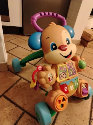 Cagnolino primi passi Fisher-Price, un compagno di giochi per i più piccoli. - Manico viola per spingere. - Orecchie e naso blu. - Ruote azzurre e verdi. - Pulsanti colorati con numeri e immagini.