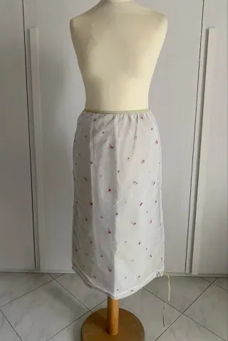 Gonna Melograno per bambina taglia 16 anni. Made in Italy, nuova ma senza cartellino, tessuto 60% cotone e 40% acrilico, primaverile, colore verde chiaro, la parte esterna in tulle bianco con ricami floreali, cerniera e bottone laterale, in fondo regolabile, vita cm 33, fianchi cm 48, lunghezza cm 72 ( cod cestemet3 nero). M - Tessuto leggero e fresco. - Fantasia floreale con piccoli fiori ricamati. - Gonna cerimonia. - Lunghezza al ginocchio circa.