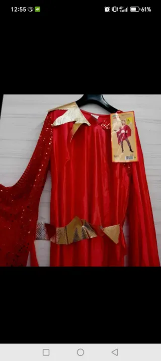 Vestito da carnevale rosso da diavolo Ideale er feste e travestimenti. - Maniche a campana con paillettes. - Cintura dorata. - Dettagli scintillanti.