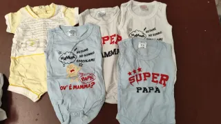 Set di body per neonato con stampe divertenti. - Body azzurro con Super Papà. - Body azzurro con Mamma, ho fame, ho sonno, coccolami e disegno. - Body bianco con Super Mamma. - Body bianco con Mamma, ho fame, ho sonno, coccolami. - Body giallo e bianco con taschino. E tanti altri