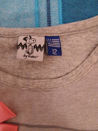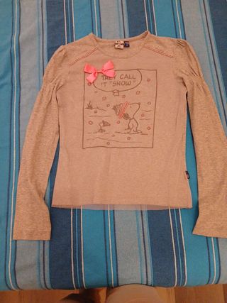 Bellissima maglietta a maniche lunghe per bambina, con stampa Snoopy. Dettagli: - Motivo Snoopy con scritta "They call it snow" - Taglia 12 anni - Colore grigio chiaro - Fiocco rosa applicato - Tessuto leggero e morbido