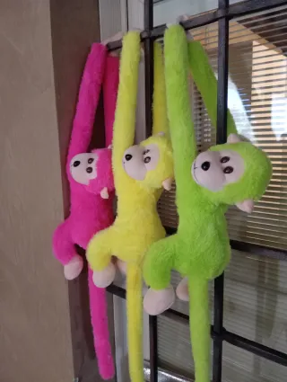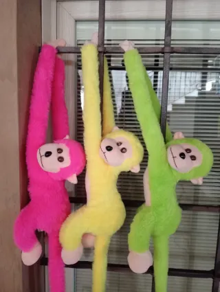 Set di tre pupazzi a forma di scimmia, perfetti per decorare o per giocare. Sono morbidi e colorati. - Colori assortiti: fucsia, giallo e verde. - Design con braccia e gambe lunghe per appenderli. - Materiale in peluche.