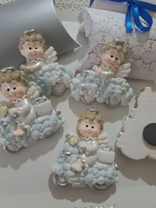 Faccio spedizione.il prezzo comprende la bomboniera Angelo con calamita ma su richiesta la fornisco compreso scatola, confetti e biglietti personalizzati con aggiunta di € 1,00 cadauna Disponibili tantissimi pezzi
