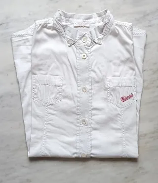 Vestitino camicia vintage da bambina firmato Gucci, made in Italy. Bello il colletto. Taschino all' altezza del petto con firma ricamata. Bottoni firmati. Presenta degli ingiallimenti sotto le ascelle ( visibili in foto). Misure: - Spalle: 25 cm - Ascella-Ascella: 35,5 cm - Lunghezza: 62 cm