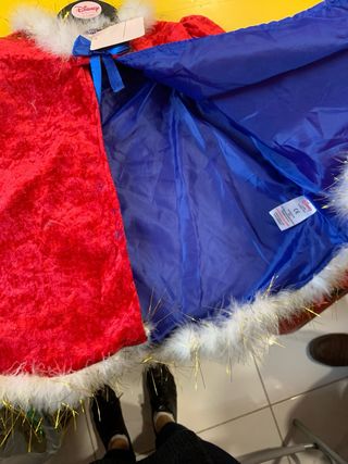 Mantella ispirata a Biancaneve, perfetta per travestimenti. - Tessuto rosso vellutato. - Bordi in pelliccia sintetica bianca. - Dettagli dorati. - Immagine di Biancaneve sul petto.