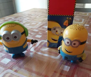 Set di due personaggi dei Minions dal film Cattivissimo Me. Uno senza scatolo. - Personaggi gialli con occhiali e salopette blu. - Un personaggio indossa cuffie verdi.