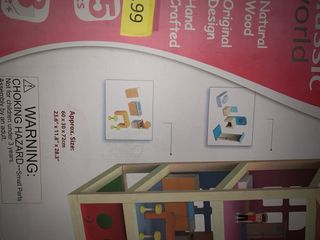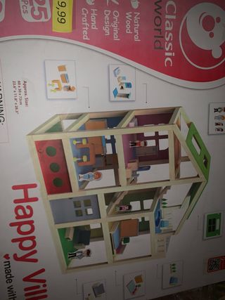 Bellissima casa in legno Happy Village per bambini, con design classico e naturale. - Materiale: Legno naturale. - Dimensioni approssimative: 60 x 30 x 72 cm. - Include accessori e personaggi per giocare.