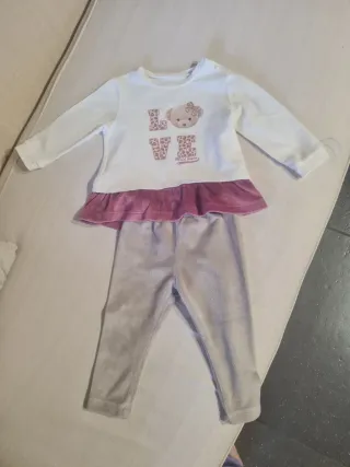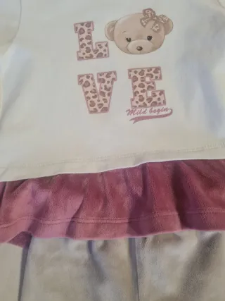 Grazioso completo per neonata, ideale per occasioni speciali o per tutti i giorni. Il tessuto è morbido e confortevole. - Colore rosa con dettagli bianchi. - Applicazione di un coniglietto sul davanti. - Collo a contrasto.